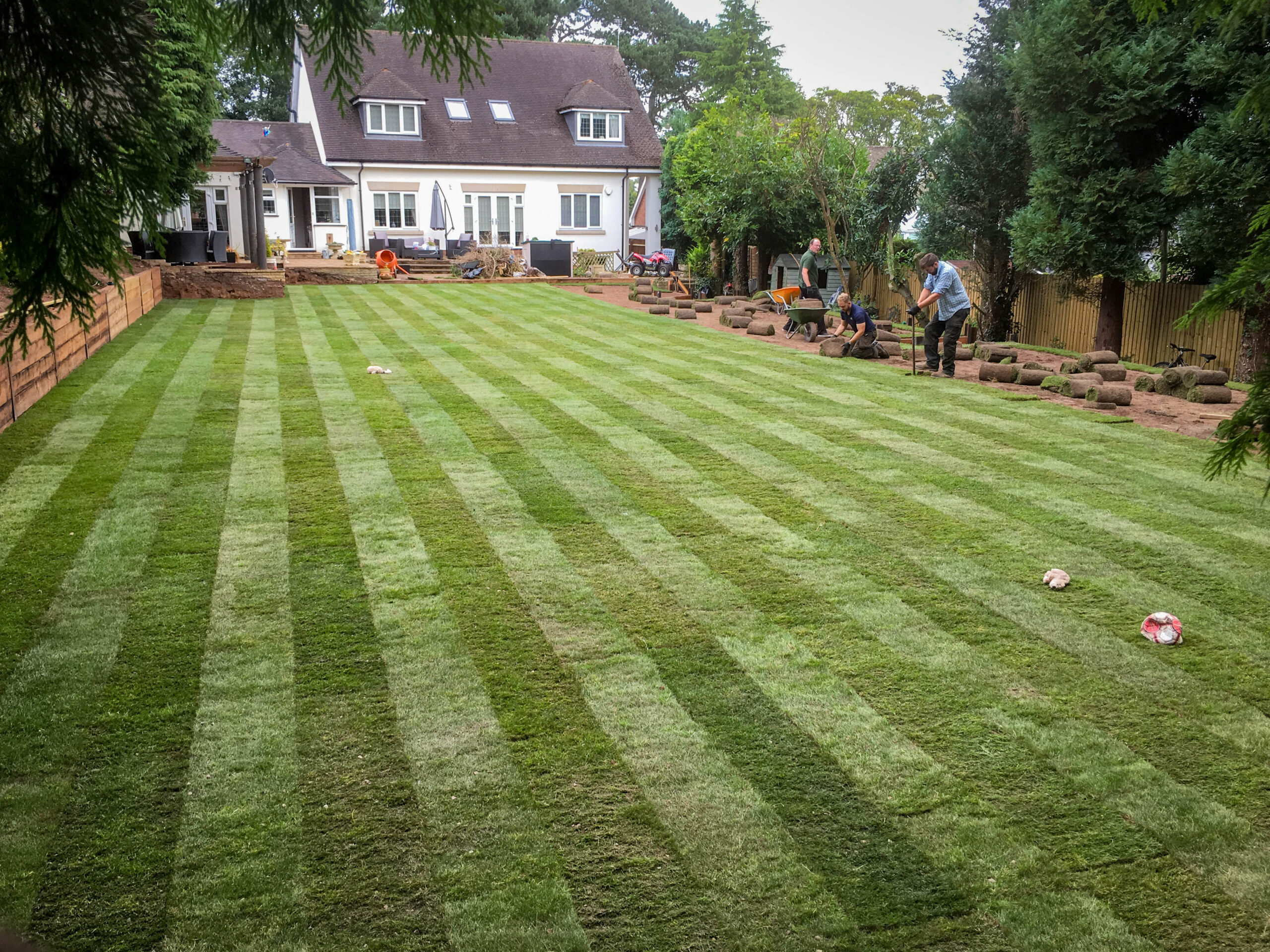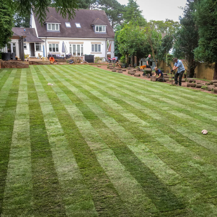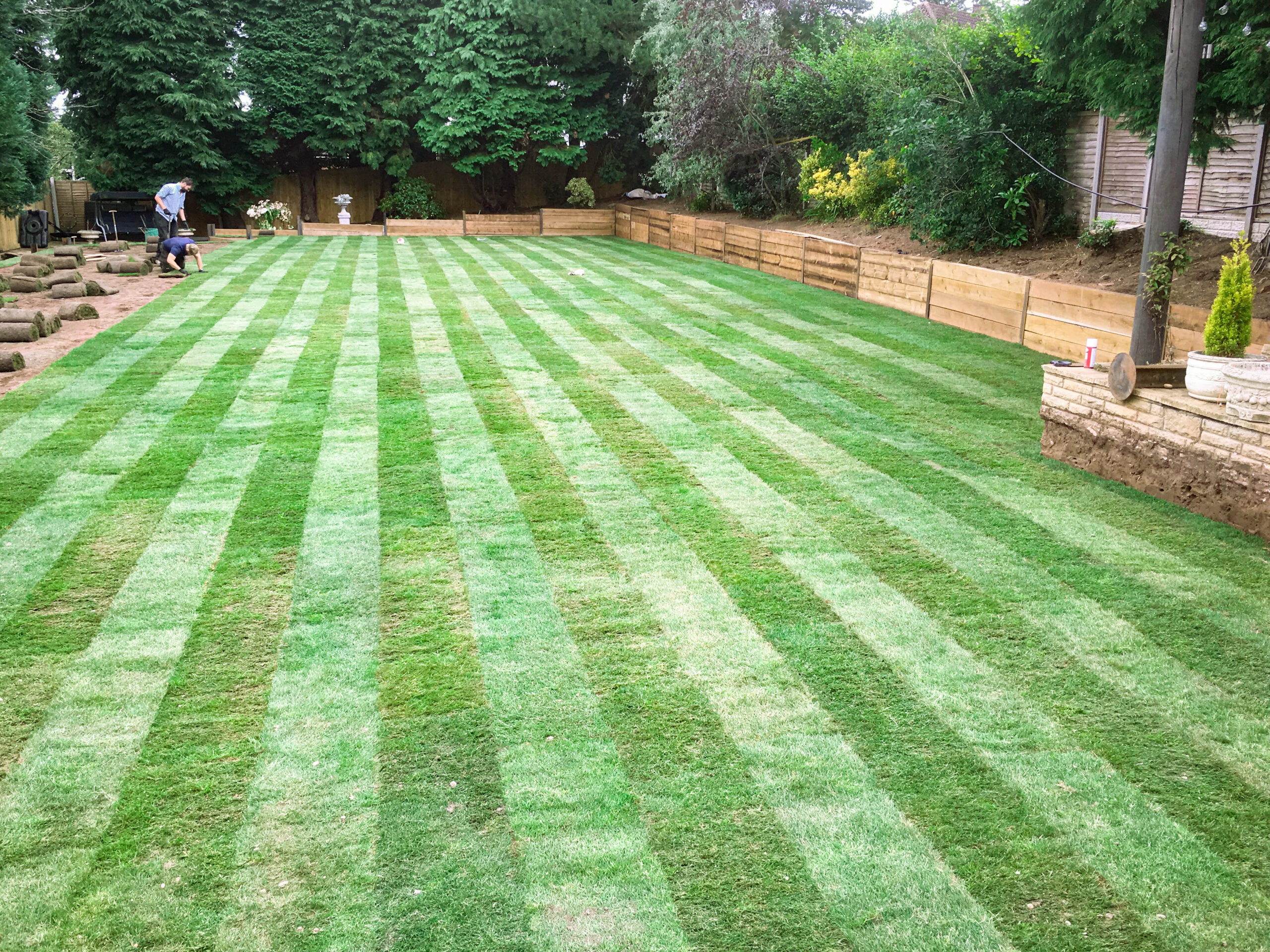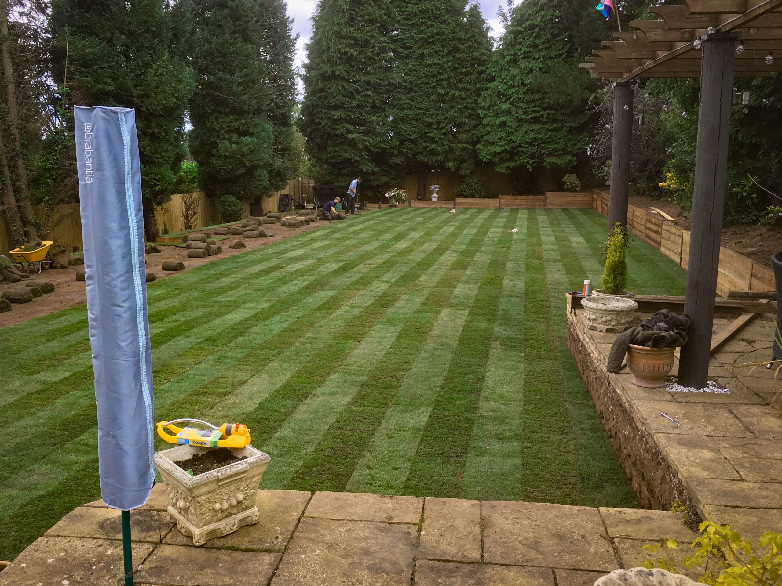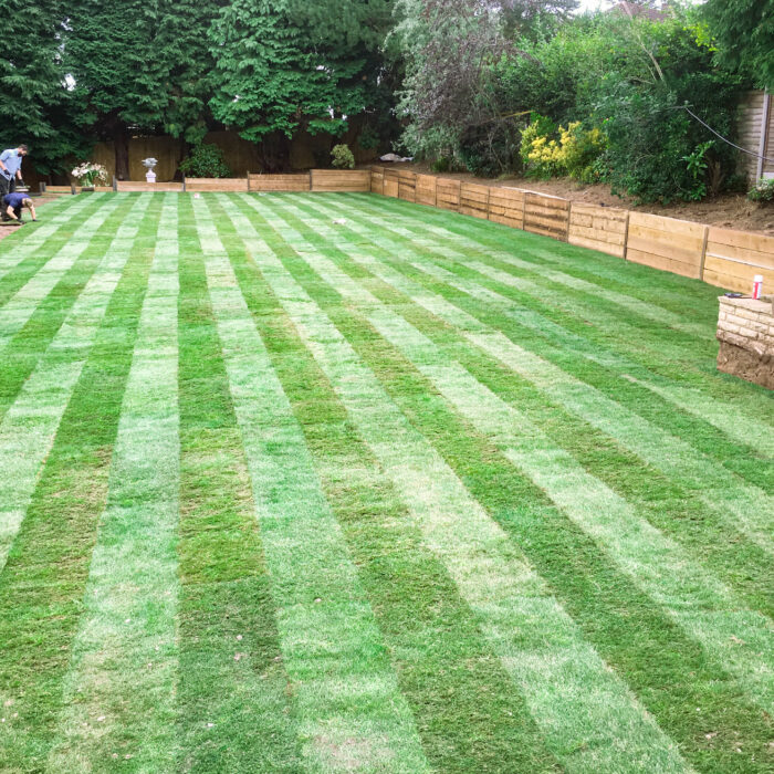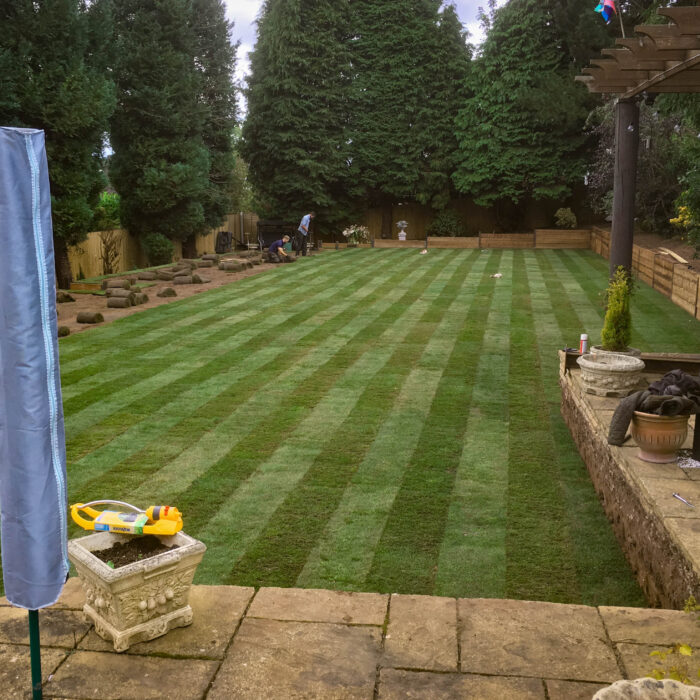 Using a mini excavator, we cut into the existing bank to create suitable access and trenching for the installation of RSJ beams. These beams, combined with high-quality wooden sleepers, formed two strong retaining walls running along each side of the garden. Once the structural elements were in place, our team levelled the ground precisely—achieving a flat, consistent surface without the need for a single bag of additional soil. With the levels perfected, we then began turfing the entire garden.