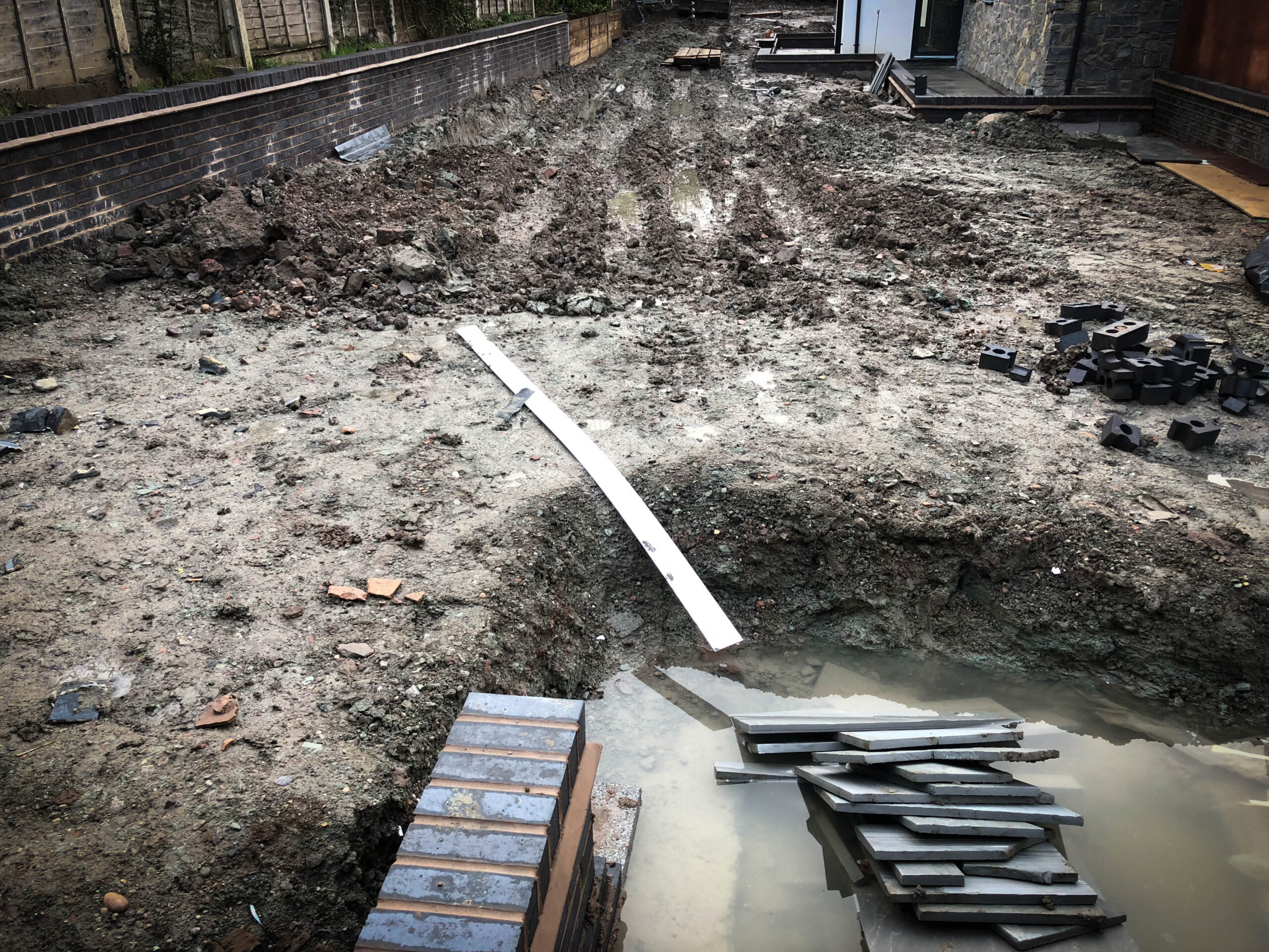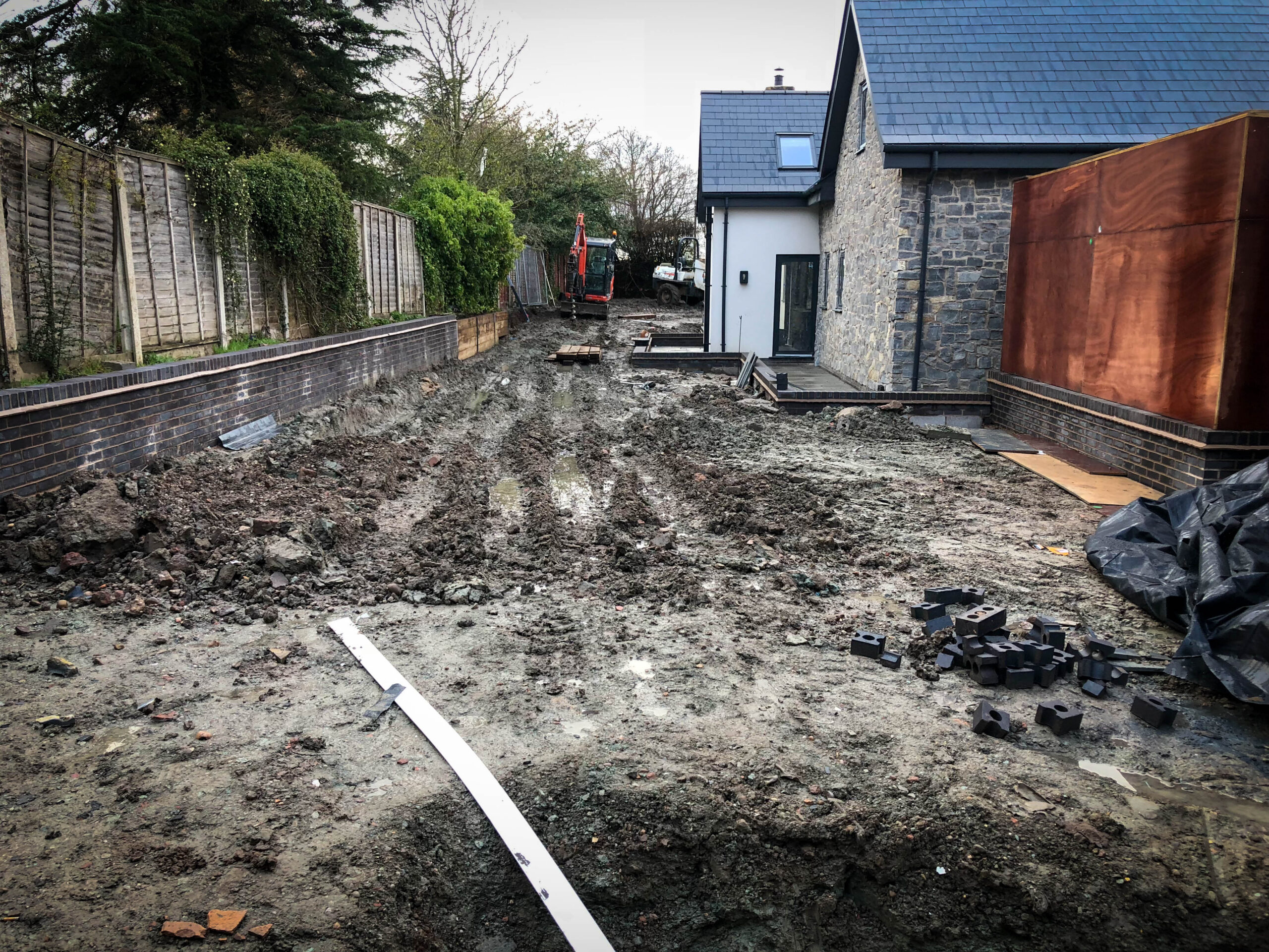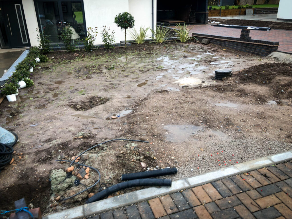 This project began with another contractor on-site, but persistent bad weather and challenging ground conditions left the garden heavily waterlogged and uneven. With progress stalled, our team was brought in to complete the transformation.